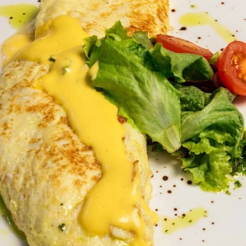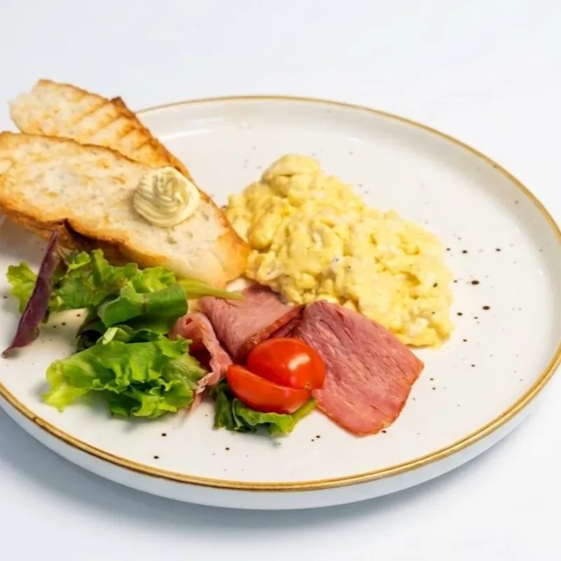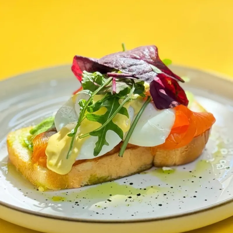 яйцо,бриошь,авокадо,маринованная лосось, сырный соус, микс салат