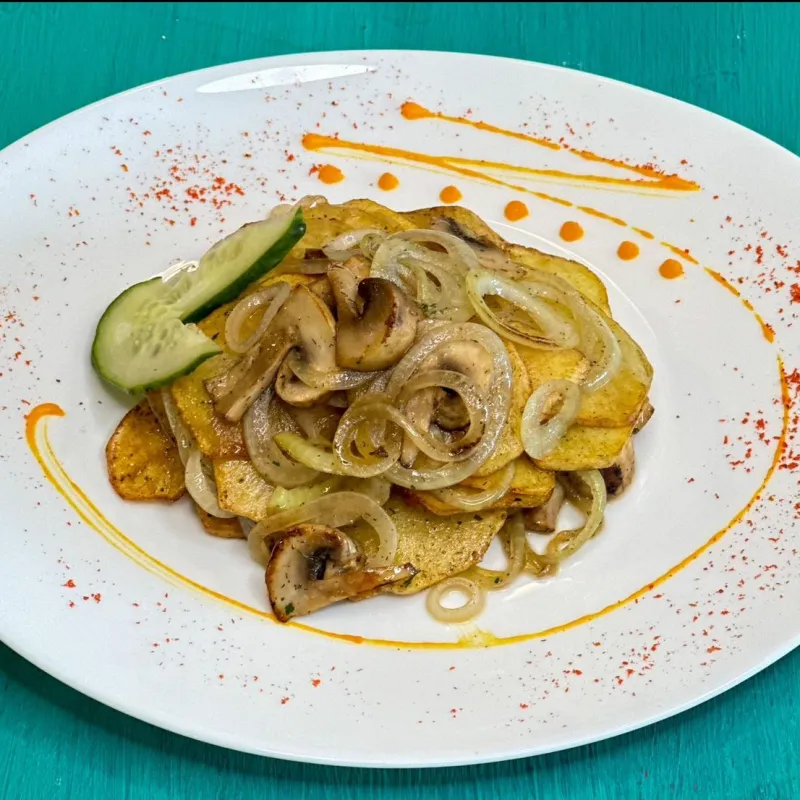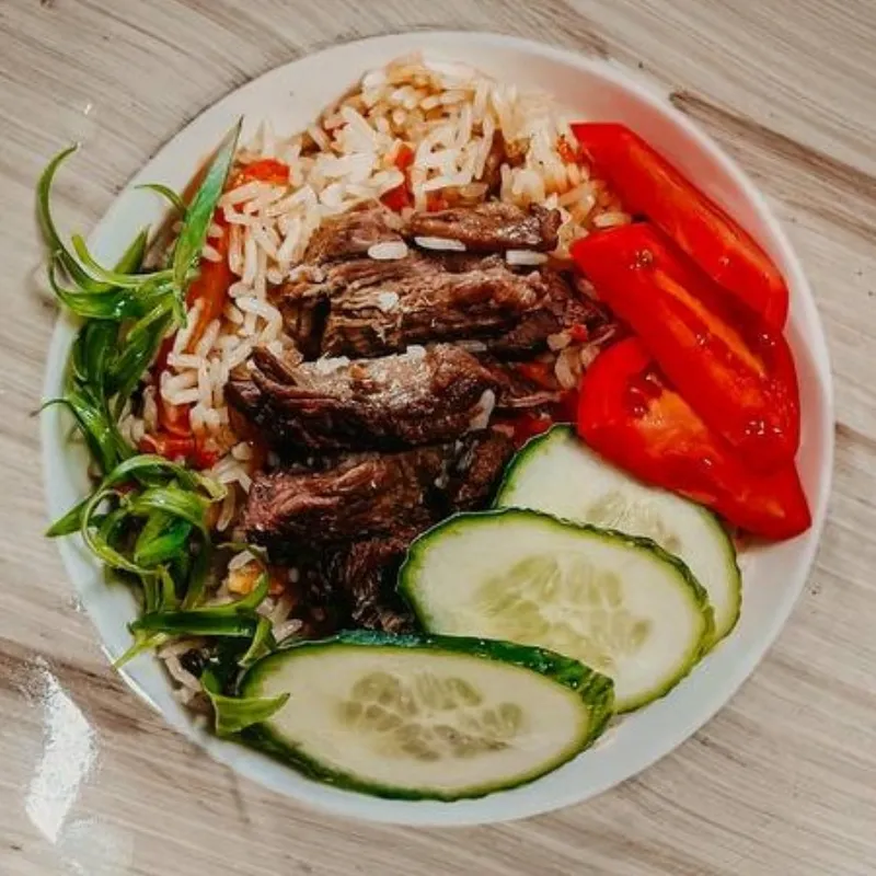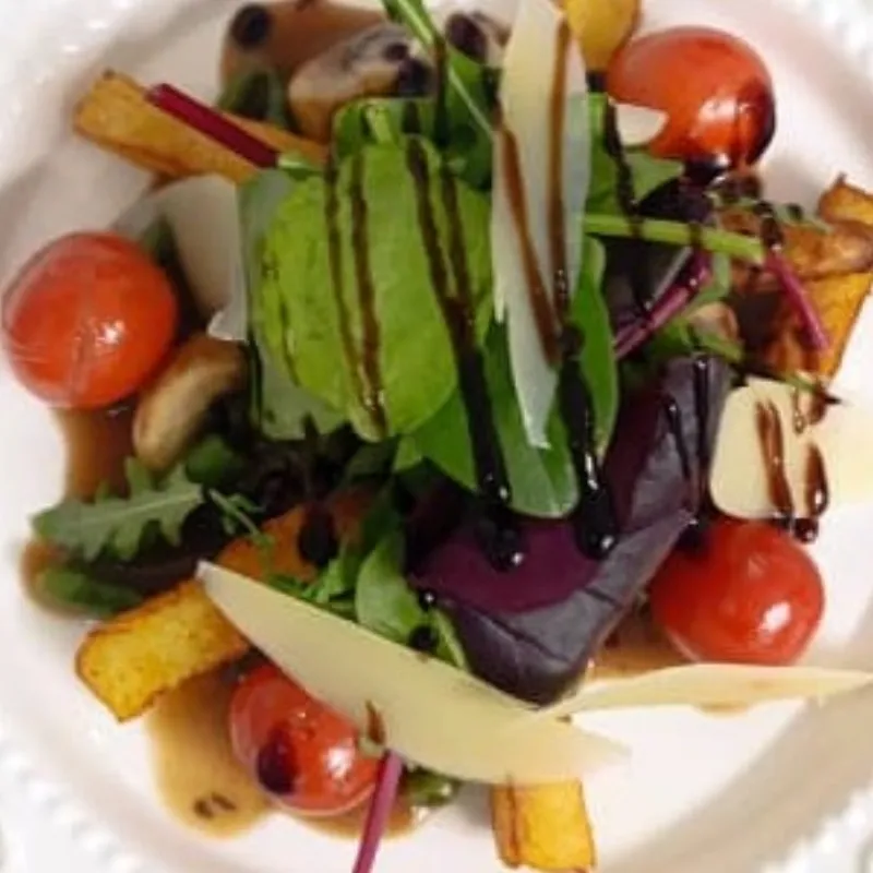 Вырезка из говядины, картофель, красный лук,грибы,помидоры черри,руколо,пармезан, стручковой фасоль,соус демиглас.
