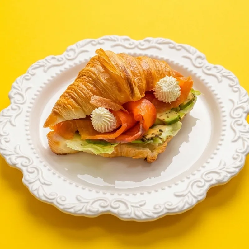 круассан,маринованная лосось ,айсберг,сыр креметта, авокадо,помидоры