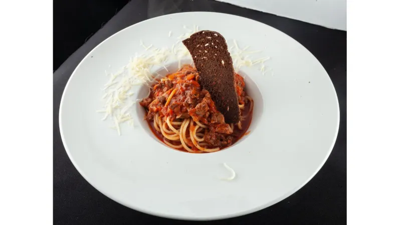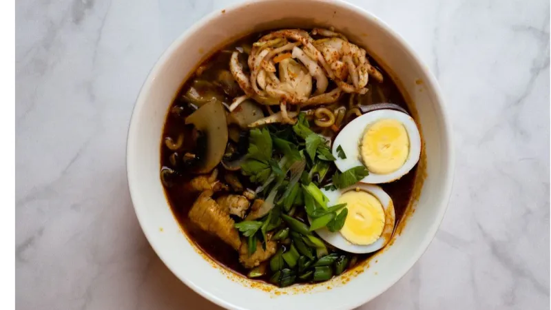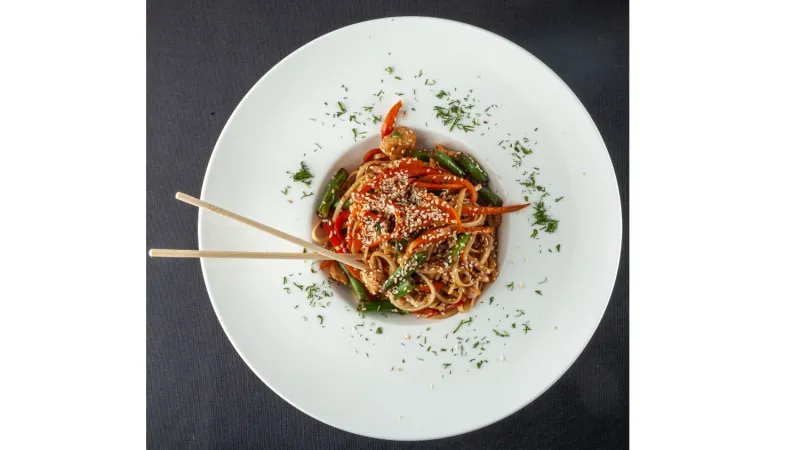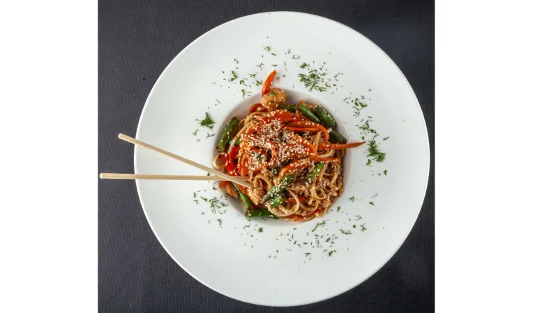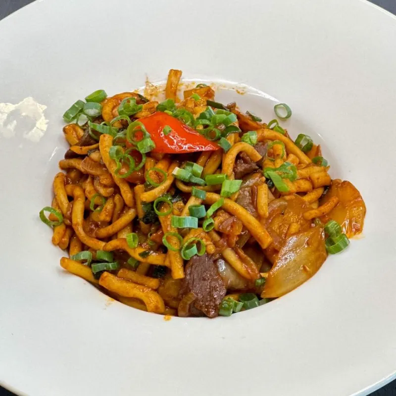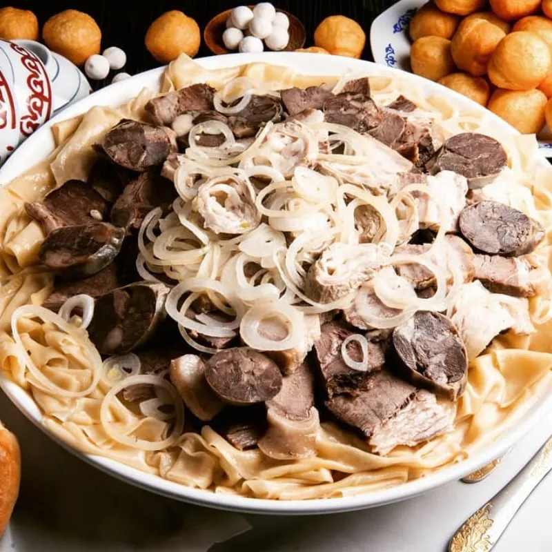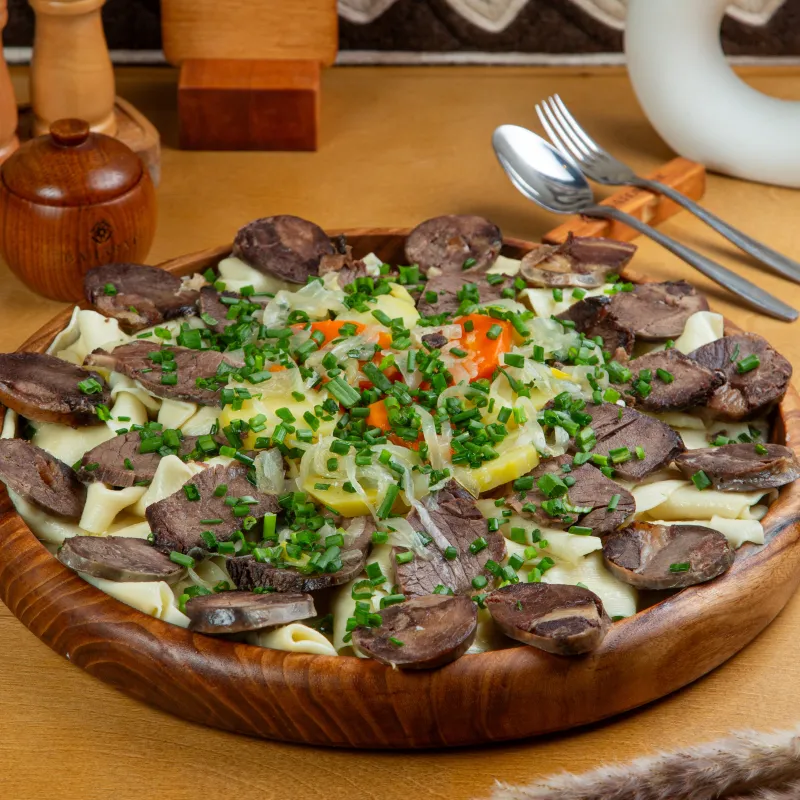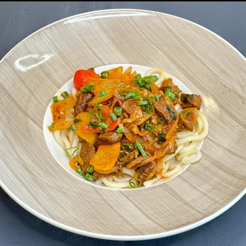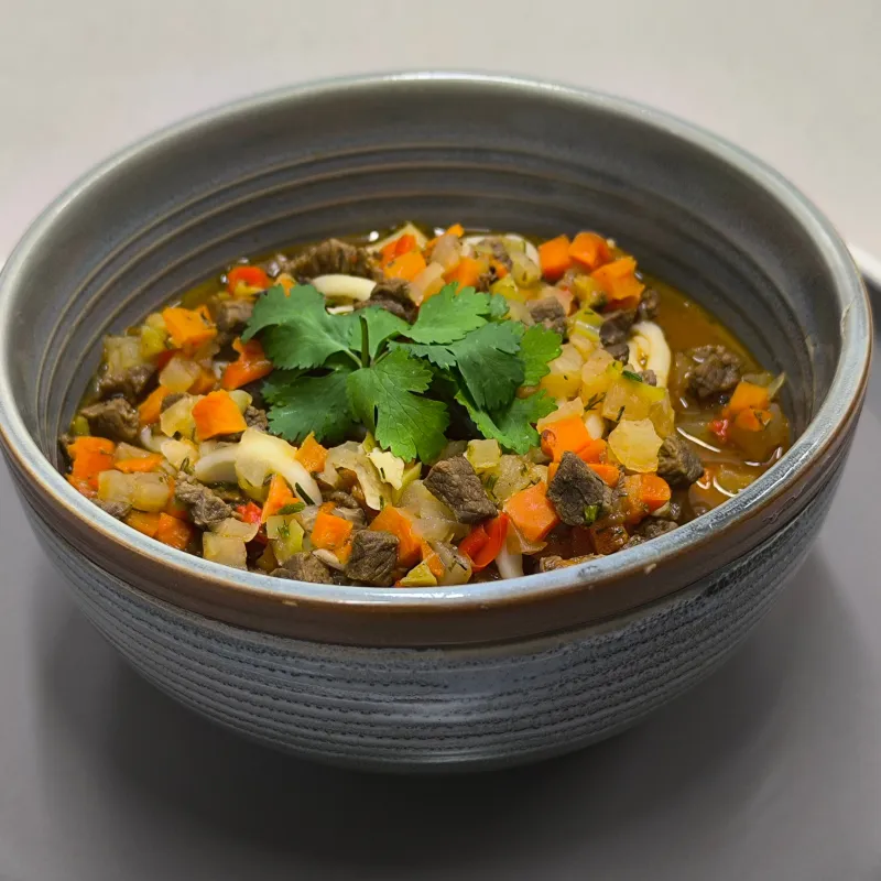 Традиционный лагман по-домашнему с мелко рубленной телятиной и овощами и небольшим бульоном