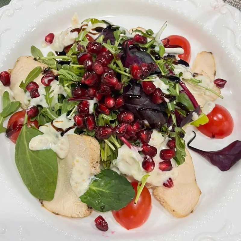 Груша,микс салат,помидоры черри,греческие орехи,гранат,курица,соус горчица мёд греческий йогурт.