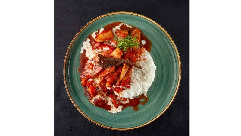куриное филе обжаренное со специями карри и томатном соусе, с рисом на пару