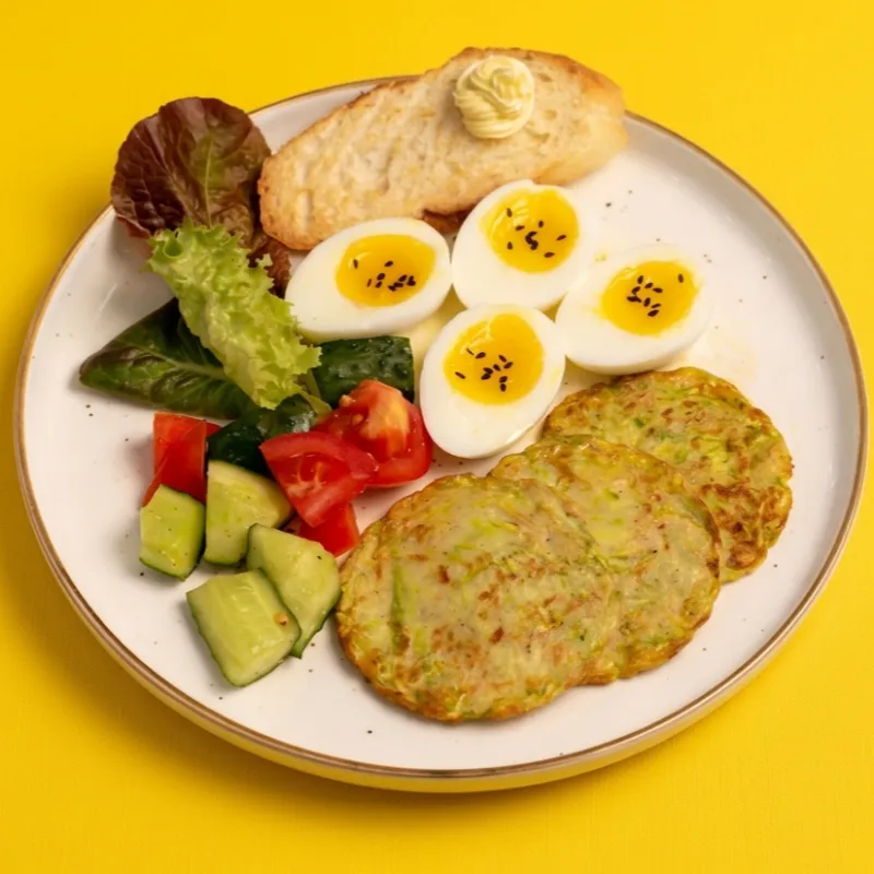 Драники из кабачков, яйцо,огурец,помидоры,багет.