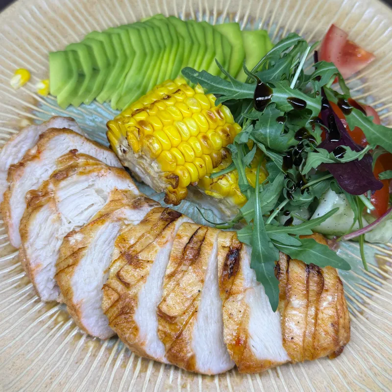 Куриная грудка,авокадо, помидоры,огурцы, микс салаты,кукуруза,яйцо,специи