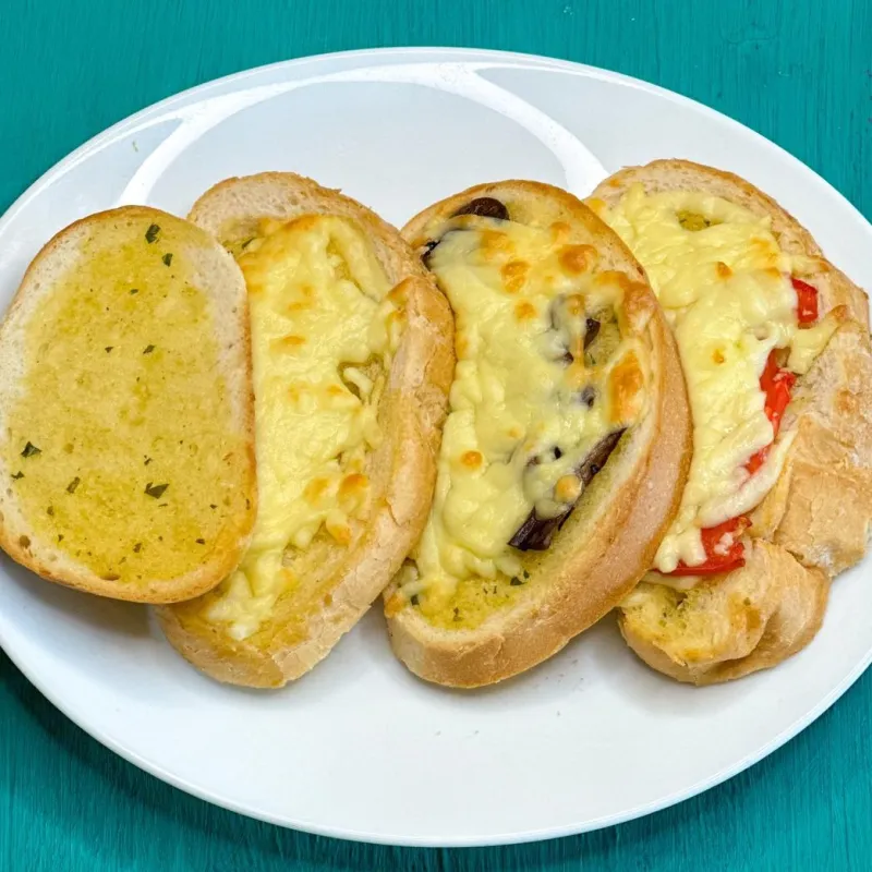 белый хлеб, чесночное масло, сыр моцарелла, помидоры, грибы шампиньоны
