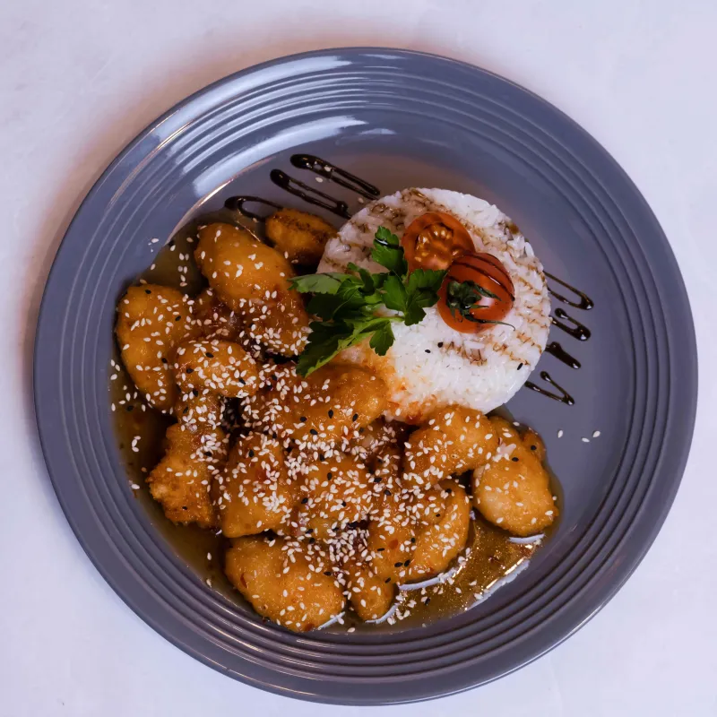 Сочные кусочки курицы в пикантном кисло-сладком соусе с рисом