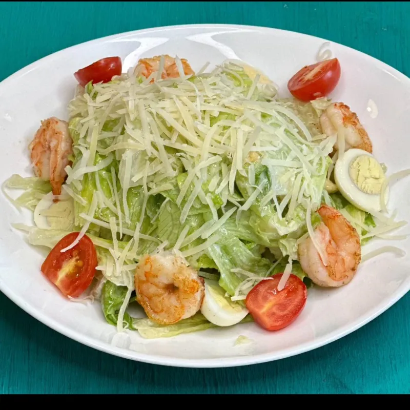 салат Айсберг, тигровые креветки, гренки, яйца перепелки, помидоры Черри, Цезарь соус