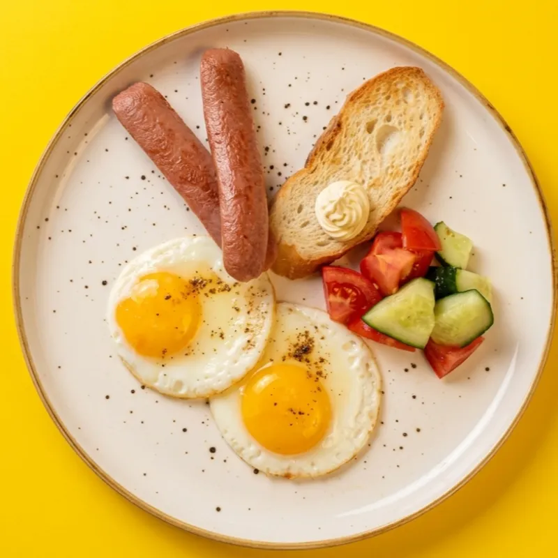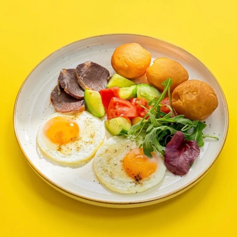 яйцо ,казы, бауырсаки со сметаной , помидоры,огурцы