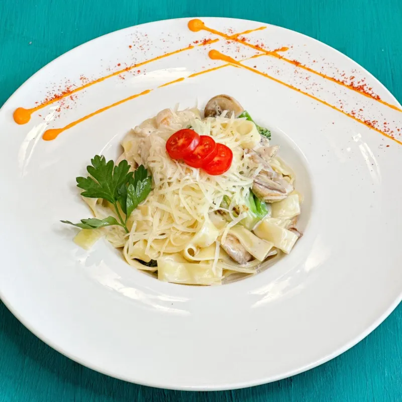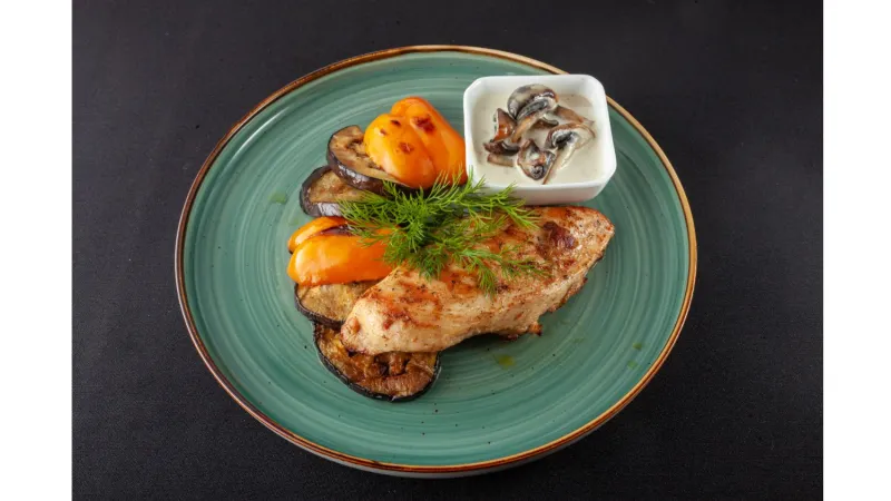 Куриная грудка обжаренная на гриле с овощами и сливочно-грибным соусом