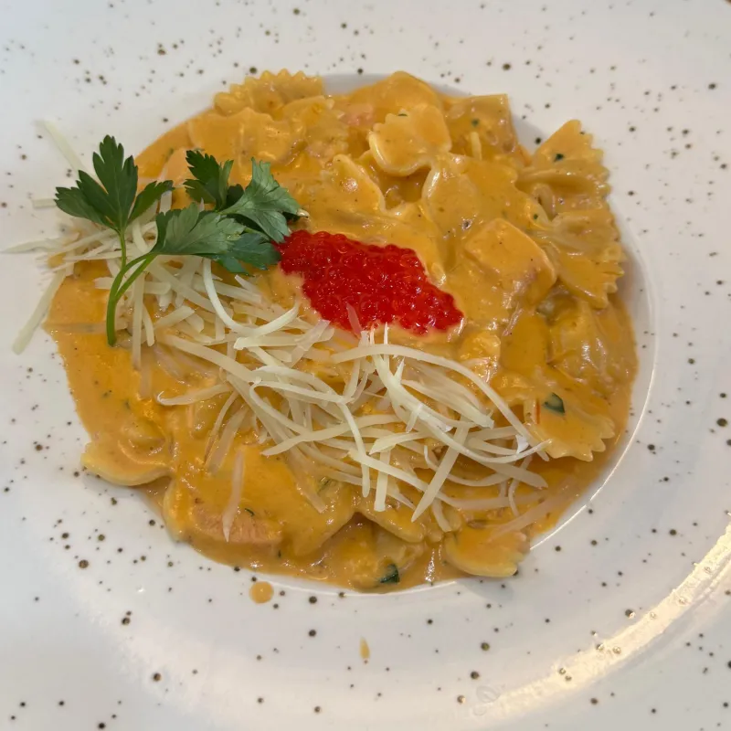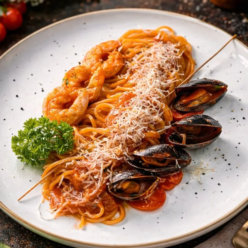 Мидии,креветки,черри помидоры,спагетти, томатный соус,чеснок,специи,острый перец чили,пармезан, пертрушка