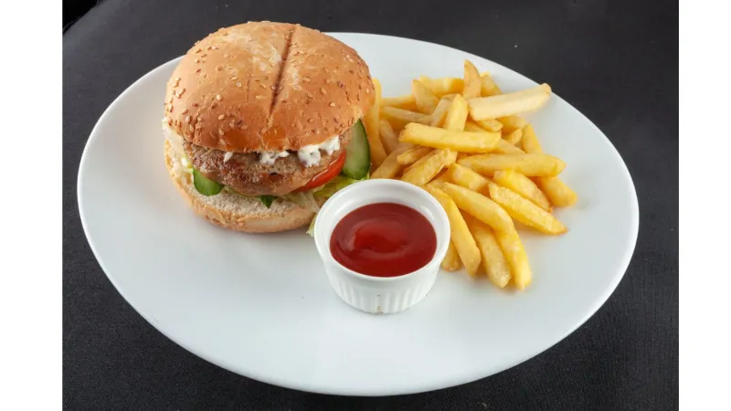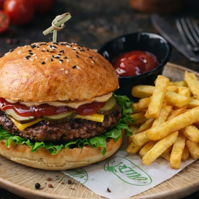 булочка, помидоры,огурцы, говяжья котлета, сыр, грибы, салат Айсберг, фри, халапеньо, кетчуп