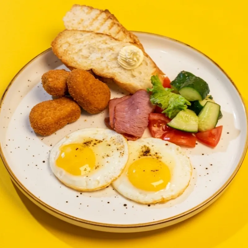 яйцо,ветчина,нагетсы,огурцы,помидоры,багет