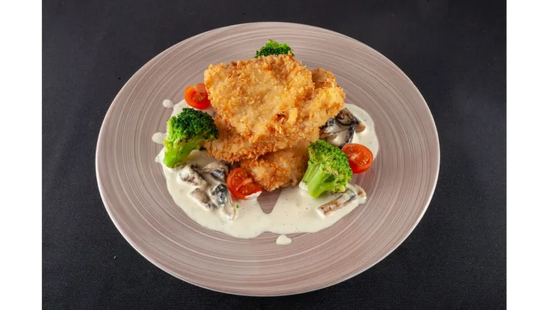 Куриное филе панированное в сухарях с брокколи в сливочным соусе