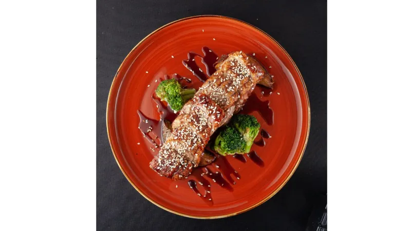 утиная грудка жаренная на гриле с гарниром из картофельных долек и брокколи в терияки соусе