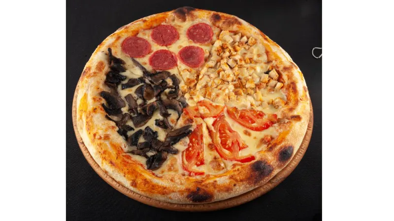 сыр моцарелла, помидоры, грибы, колбаса, курица