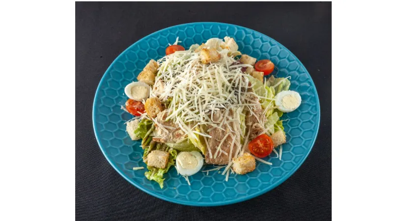 салат Айсберг, куриное филе, гренки, яйца перепелки, помидоры Черри, Цезарь соус