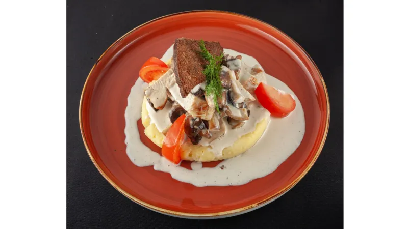 куриное филе обжаренное в сливочном соусе с грибами, подается с картофельным пюре