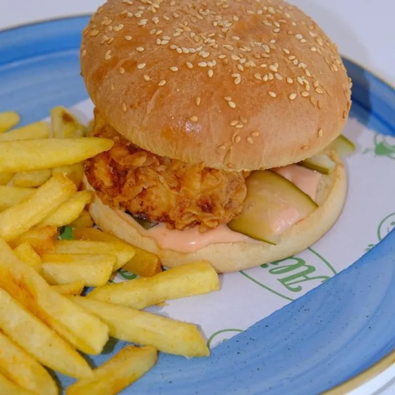 хрустящее куриное мясо, соленый огурец, бургер соус, фри
