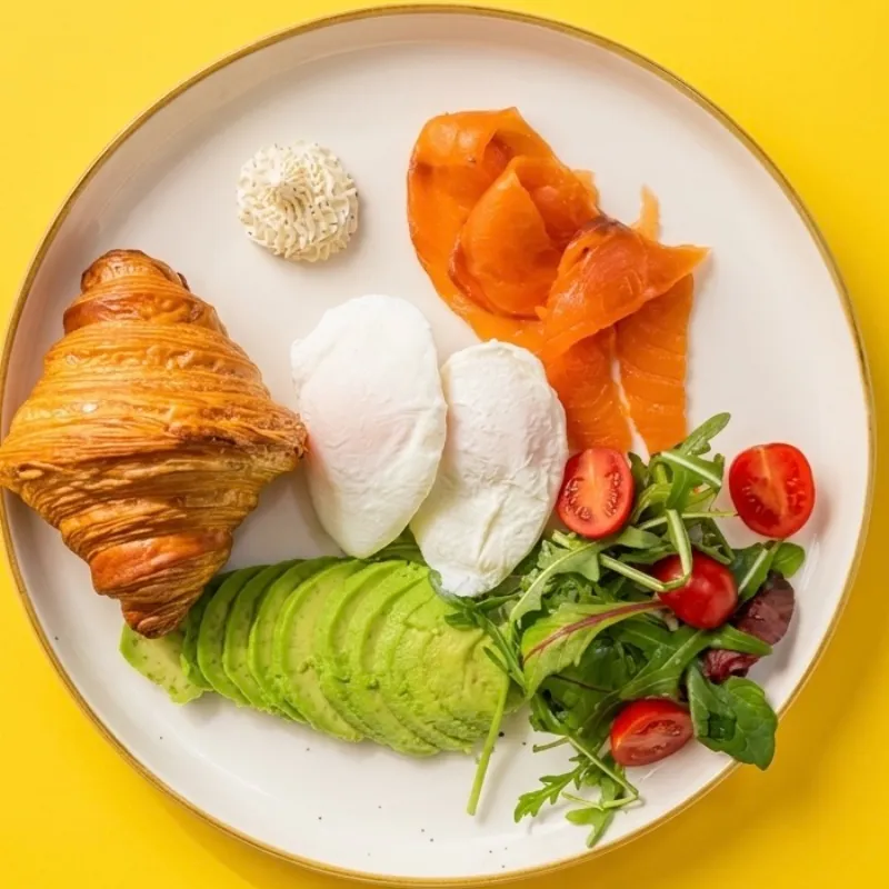 мини круассан,яйцо пашот,авокадо,лосось,сыр креметта,микс салат,помидоры черри