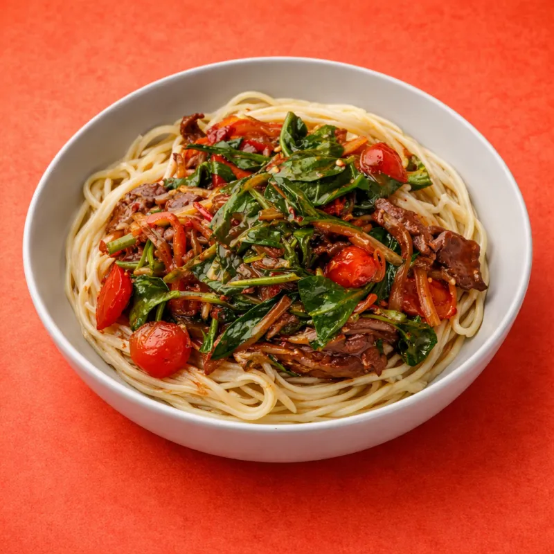 лагман с двойной порцией говядины, шпинатом, перцем, китайской капустой
