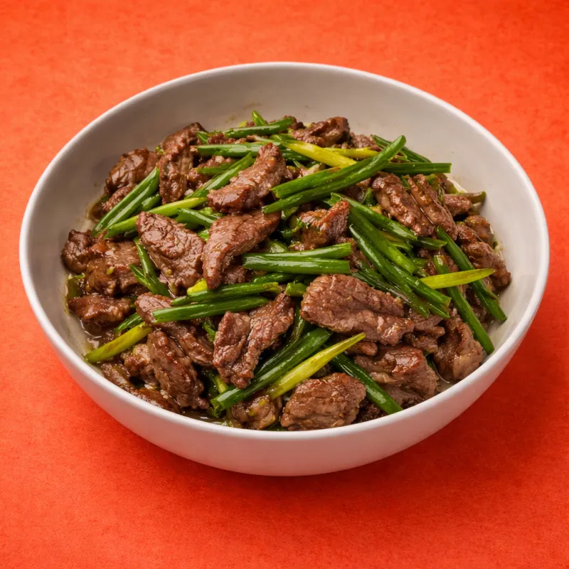 нежные кусочки поджареной говядины с зеленым луком и специями