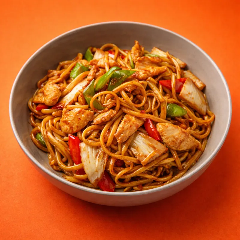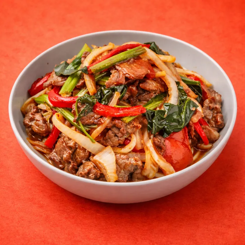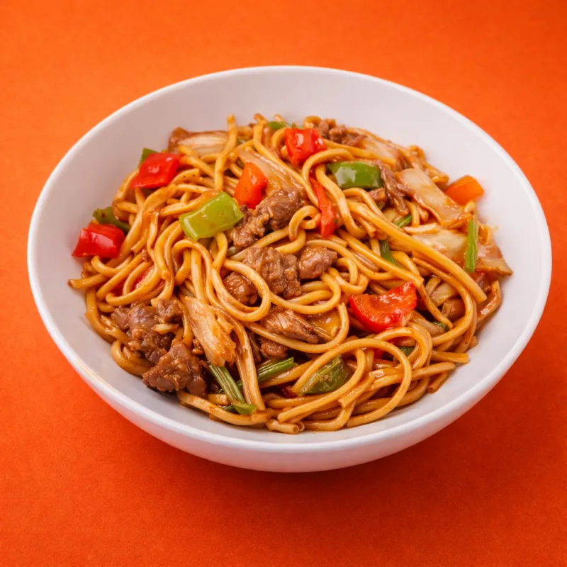жаренный лагман с овощами и говядиной, на соевом соусе с чесноком