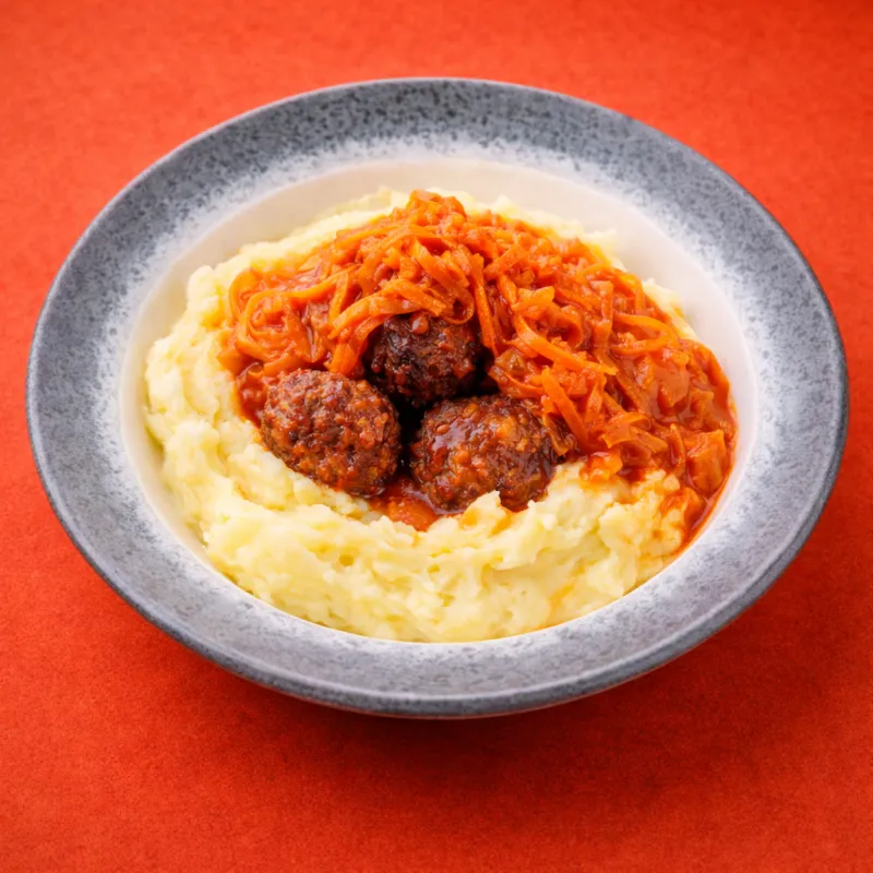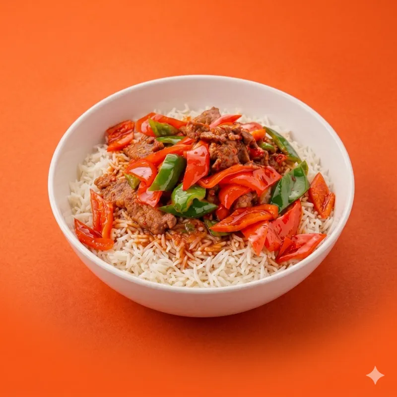 мелко нарезанные овощи с говядиной и тестом обжаренные со специями и соусом