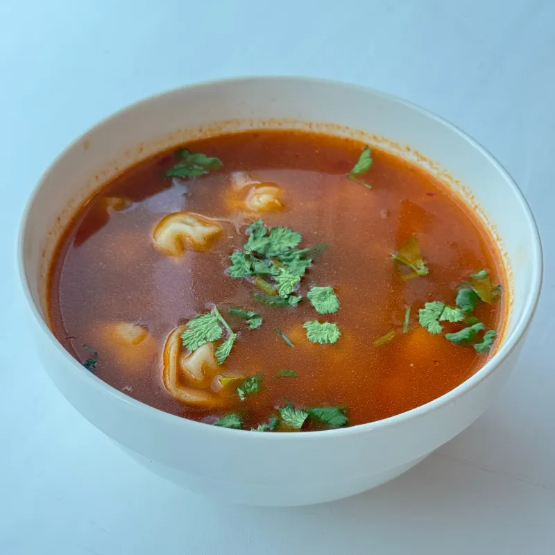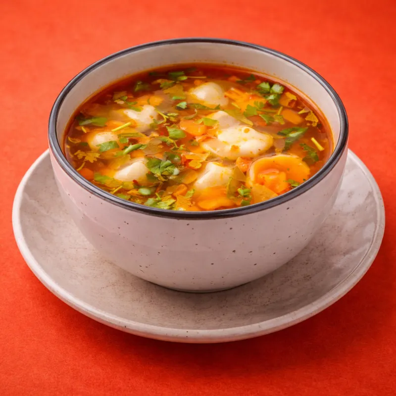 кисло-острый суп с кусочками теста с мясом и зеленью с особым ароматом