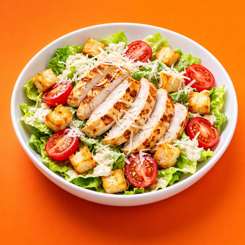 традиционный французский салат с курицей, сыром Пармезан и сухариками