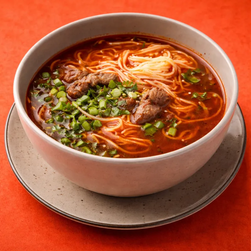 фирменный суп с сыром тофу, шпинатом, говядиной и лапшой