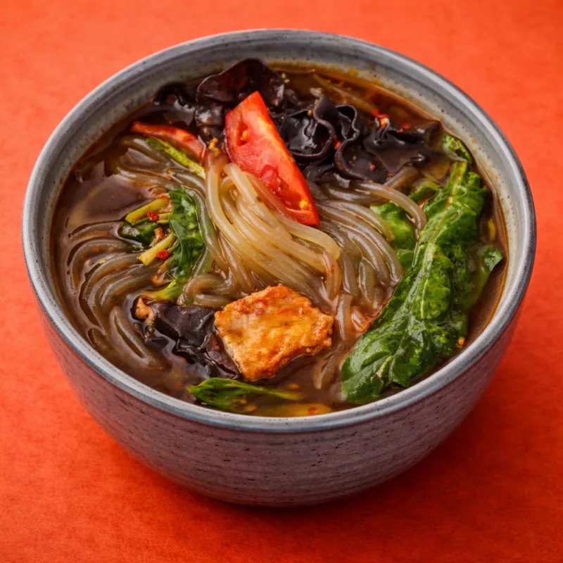 кисло-острый суп с мясом, черными грибами и фунчезой, с ароматом специй
