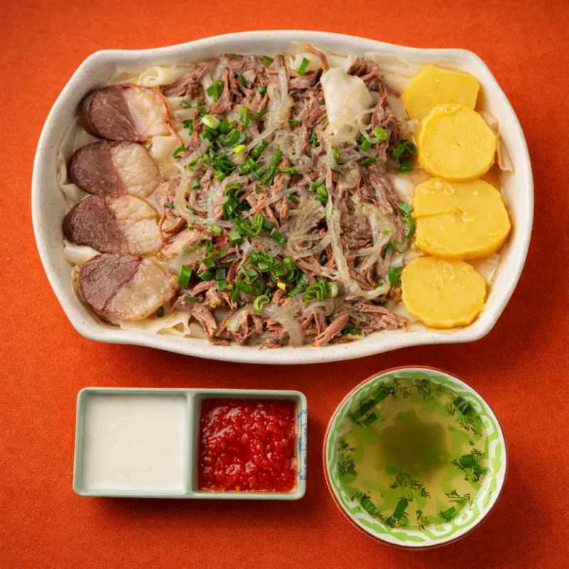 национальное блюдо с говядиной, вяленой кониной и казы, туздык с бульоном