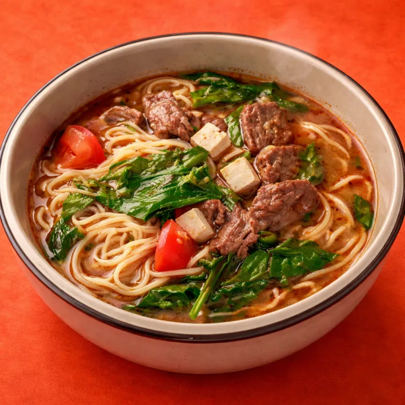 фирменный суп с сыром тофу, шпинатом, говядиной и лапшой