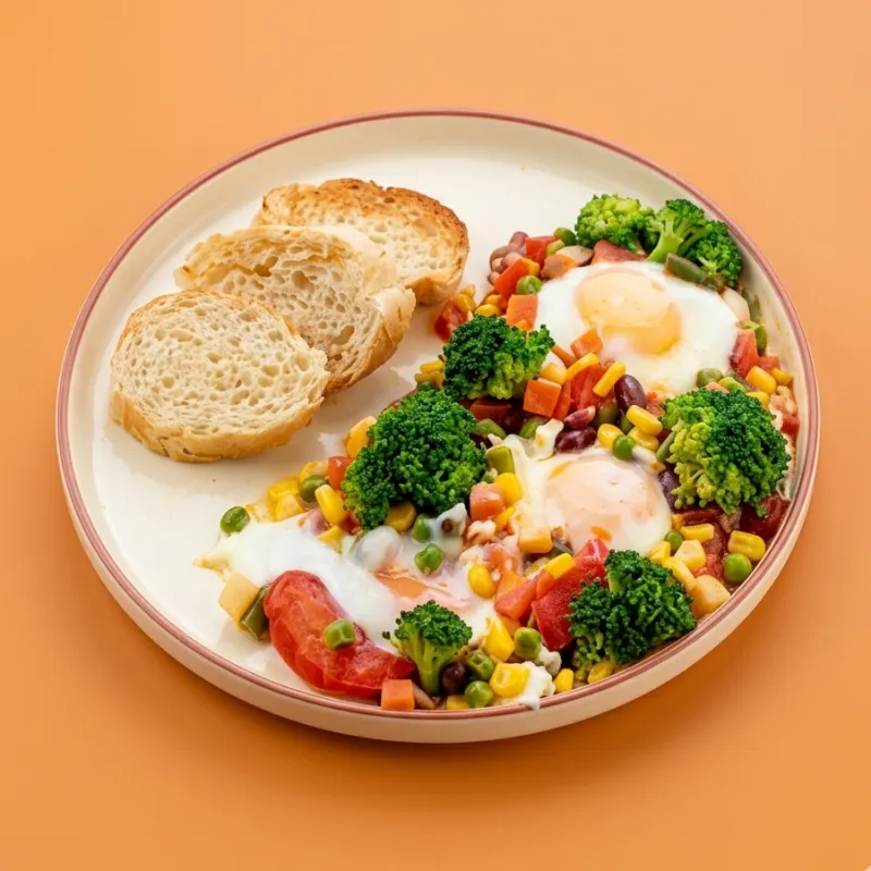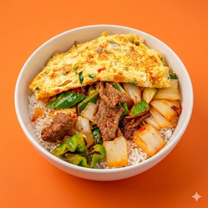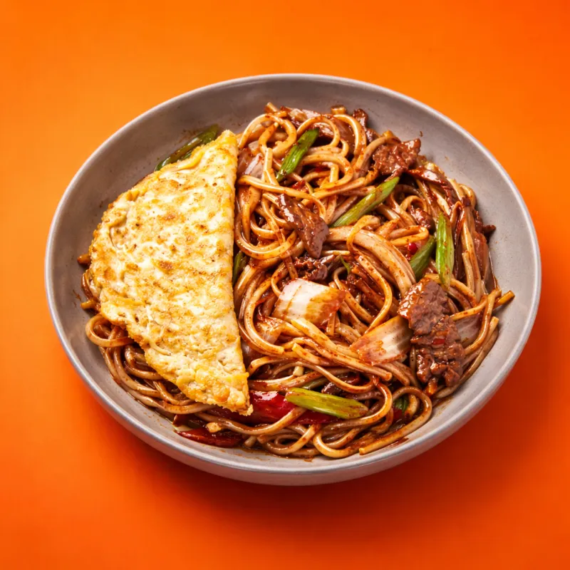 жареные овощи с мясом, специями и соусами, подается с яичным блинчиком