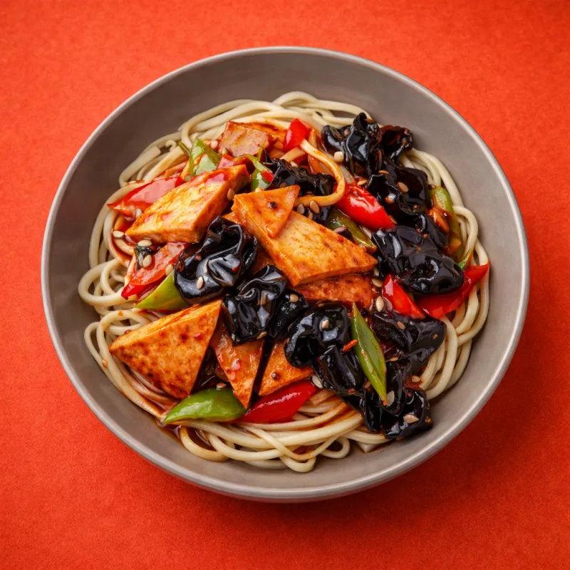 блюдо с черными грибами, зеленым луком и тофу