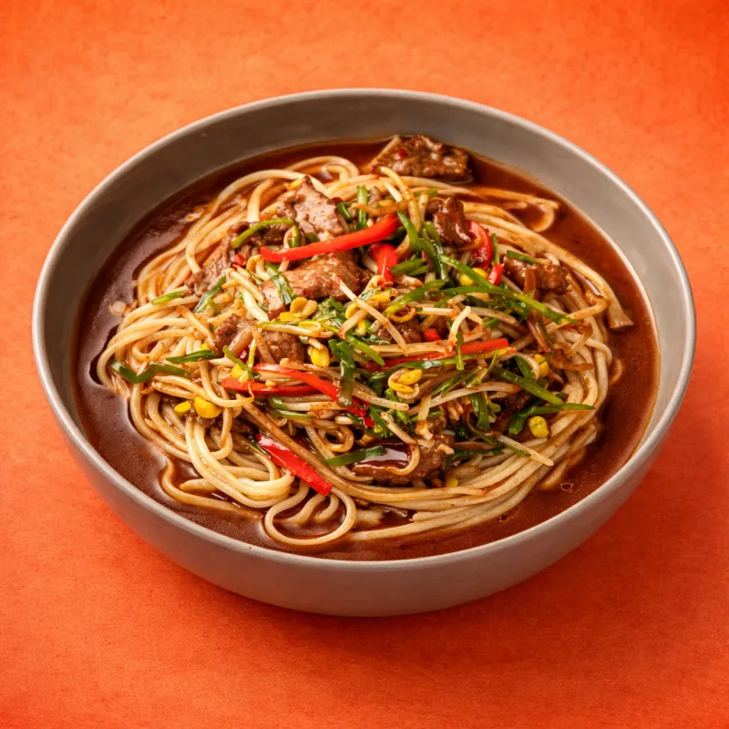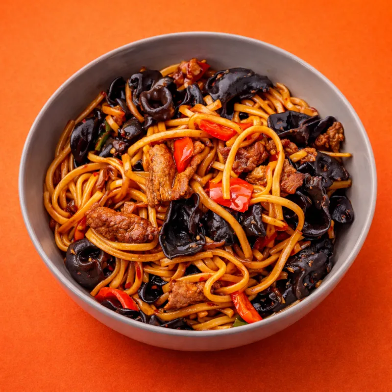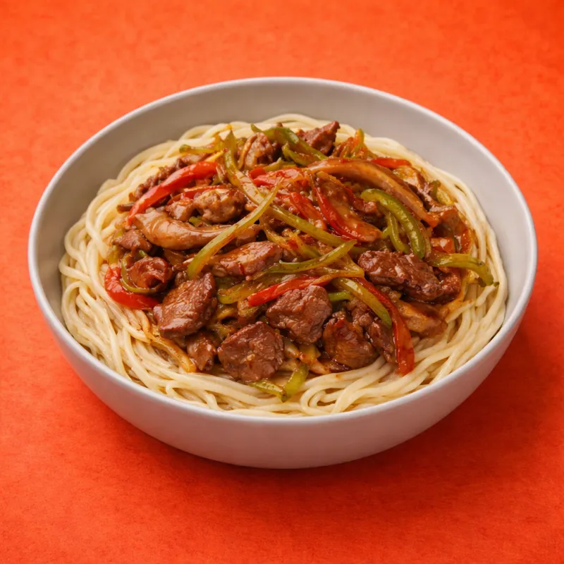 вкусный лагман с поджареными говядиной и вешенками