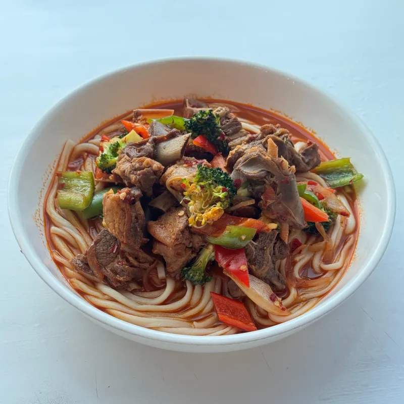 лагман с двойной порцией говядины, шпинатом, перцем, китайской капустой