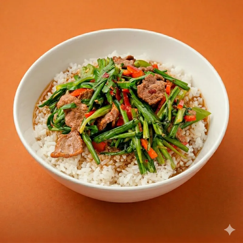 блюдо из говядины, зеленого лука, тофу и перца