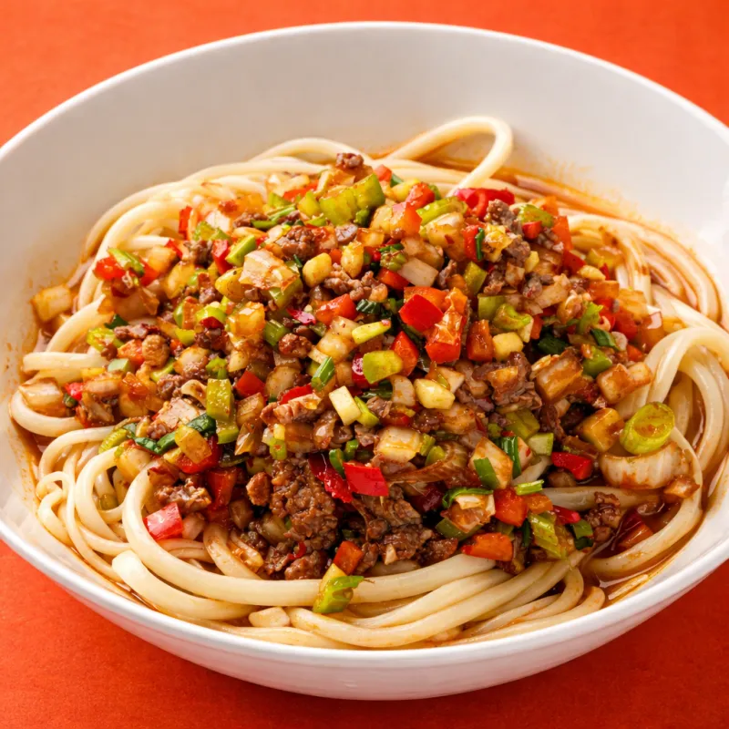 жаренный лагман с подливом мелко рубленых овощей и мясо