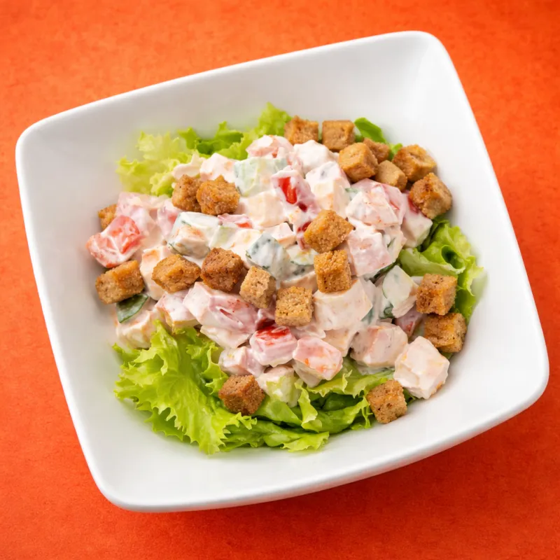 традиционный французский салат с курицей, сыром Пармезан и сухариками
