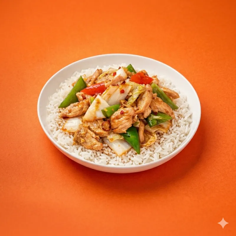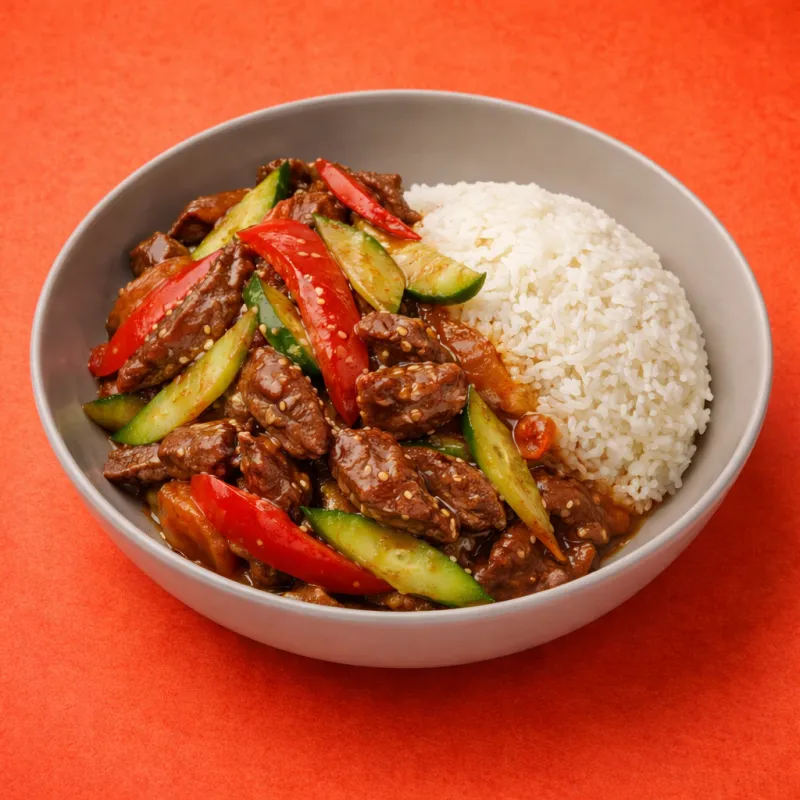 жаренная говядина с овощами по-тайски, подается с рисом