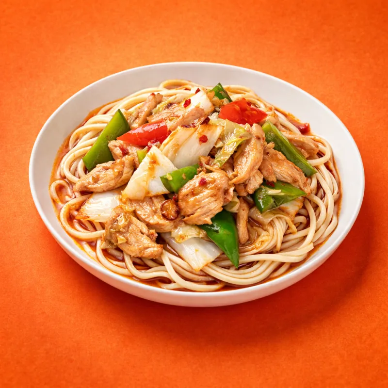 жаренный лагман с овощным подливом без мяса со специями