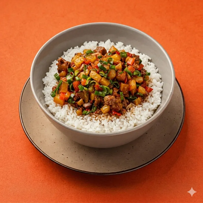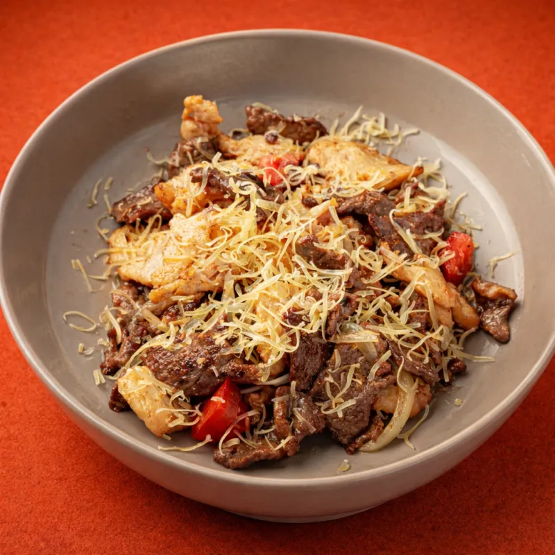 мелко нарезанные овощи с говядиной и тестом обжаренные со специями и соусом