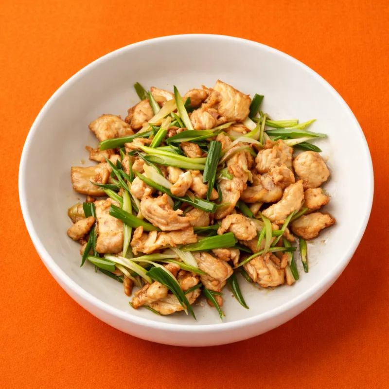 кусочки жареного филе курицы приправленного специями ароматными пряностями с зеленым и репчатым луком