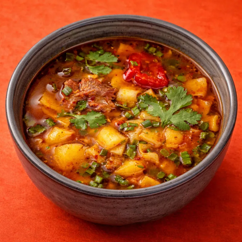 кисло-острый суп с кусочками теста с мясом и зеленью с особым ароматом