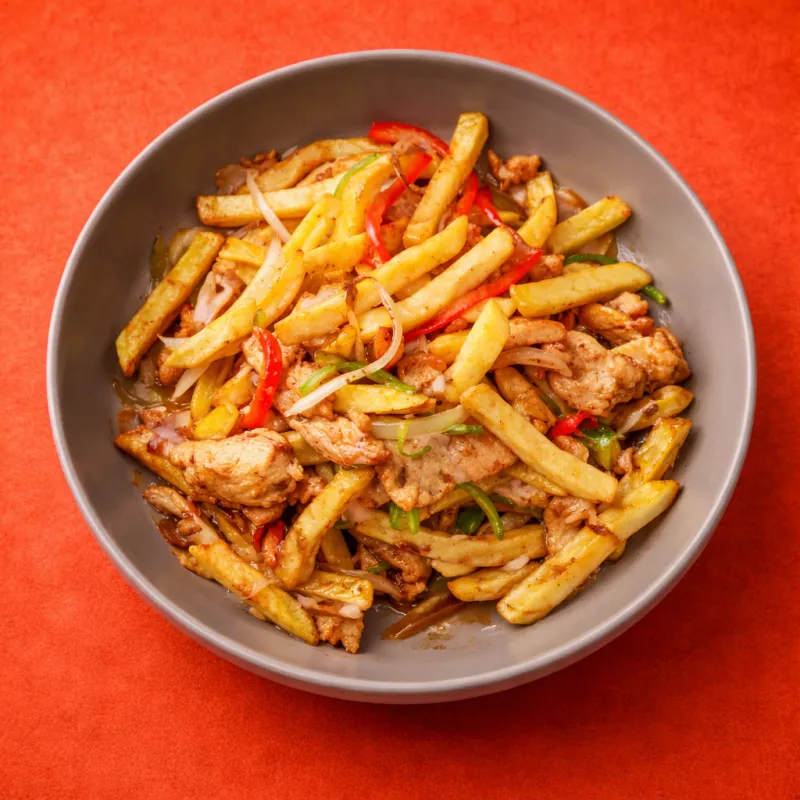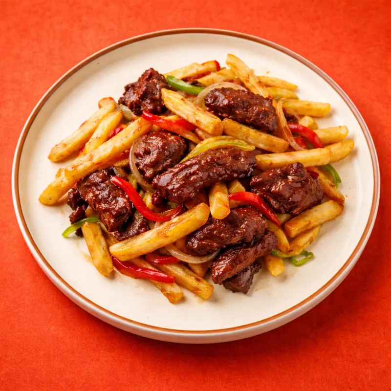жареные кусочки говядины с картофелем фри