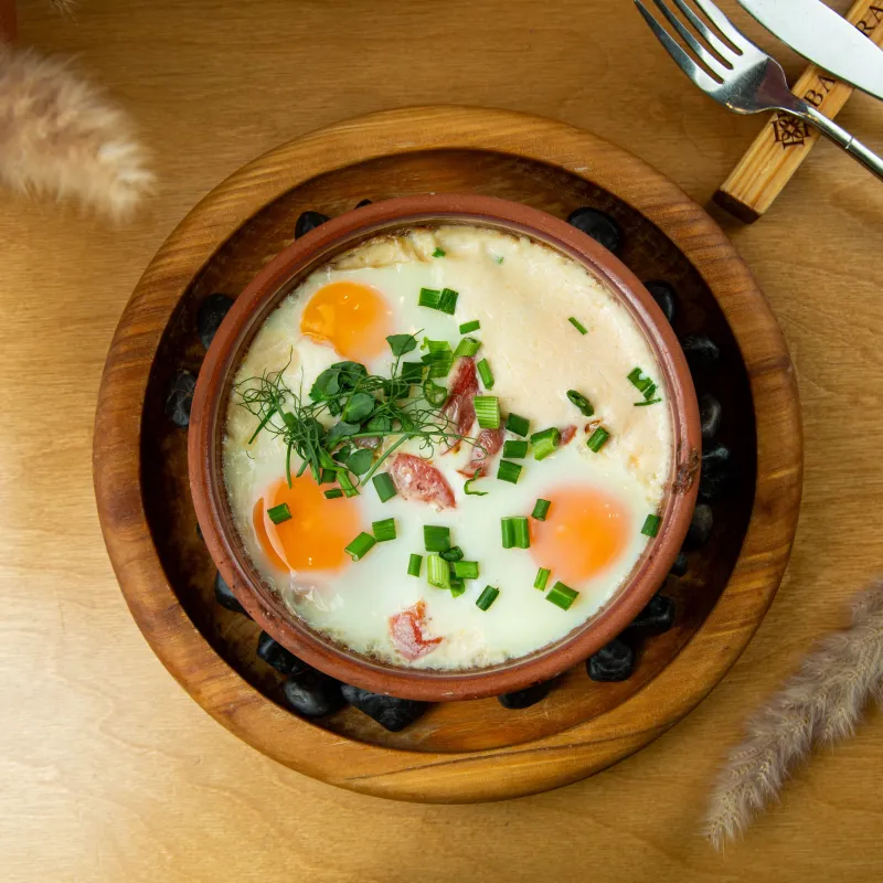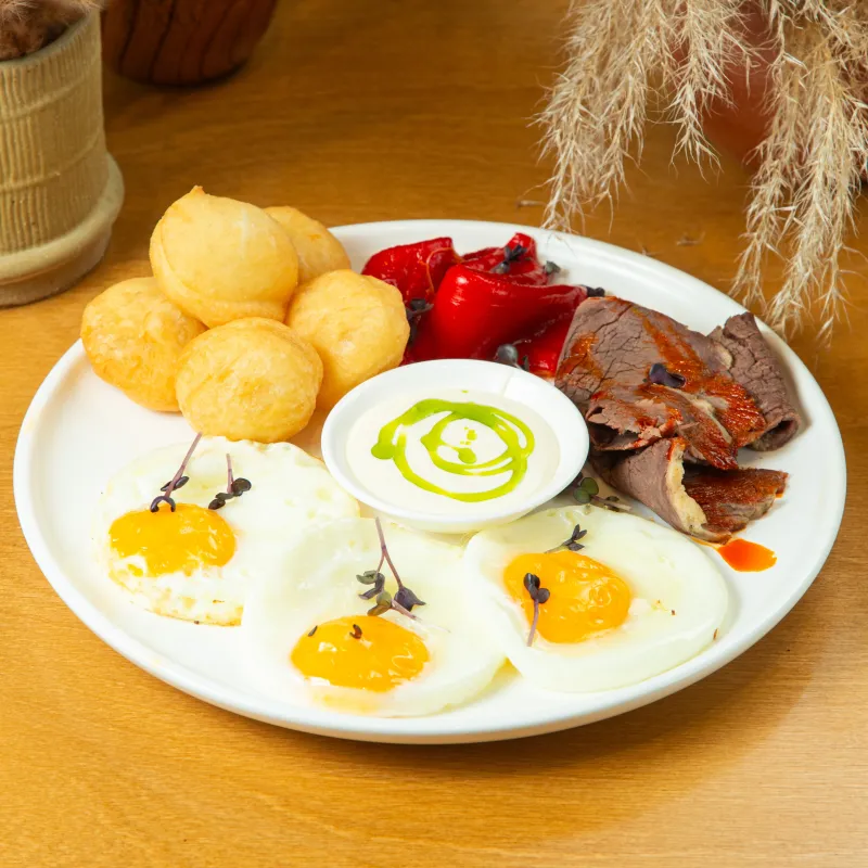 Нежные яйца-глазунья, ароматное мясо конины, воздушные баурсаки и сочный запечённый болгарский перец.