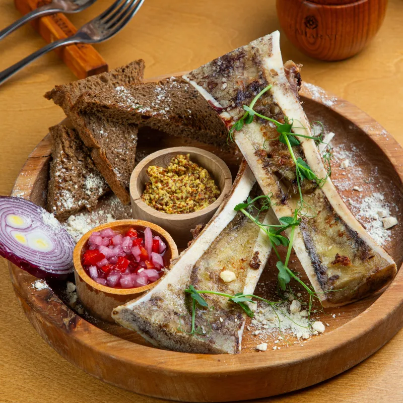 Мозговые косточки с мясом из говядины, подается со сметаной и восточным соусом.