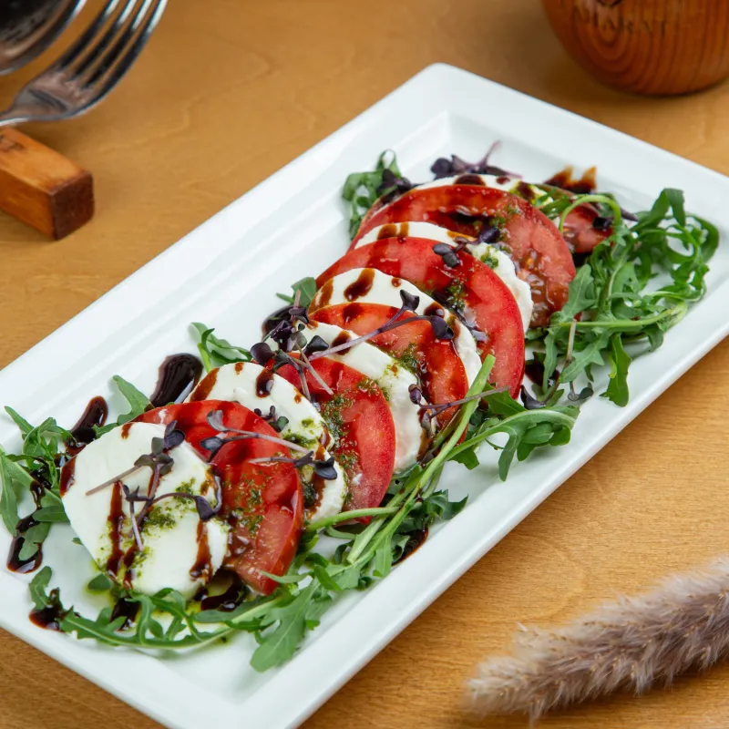 Помидоры, сыр galbani, руккола, заправляется соусом песто.