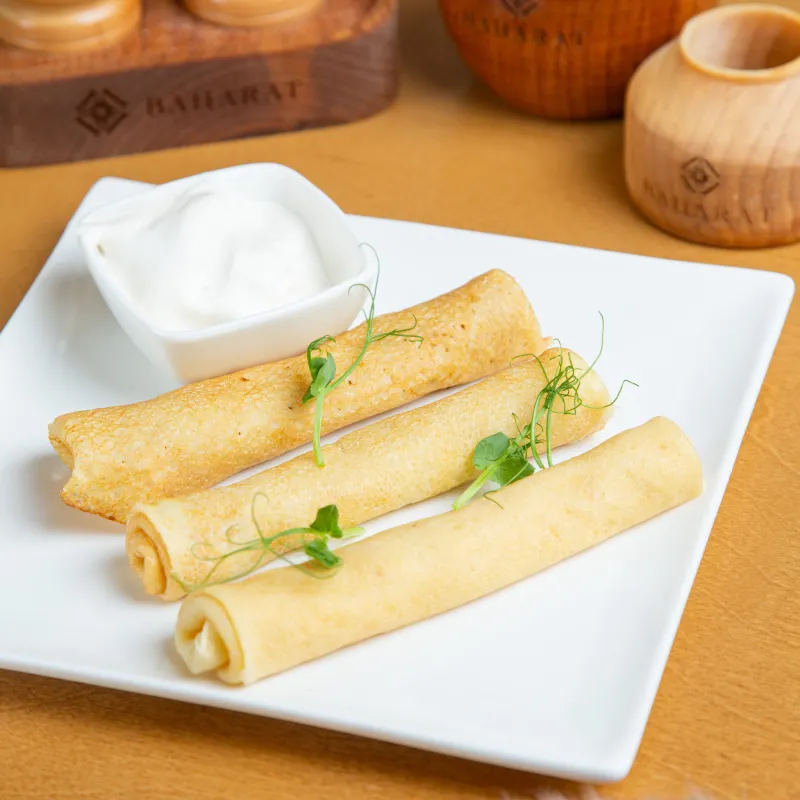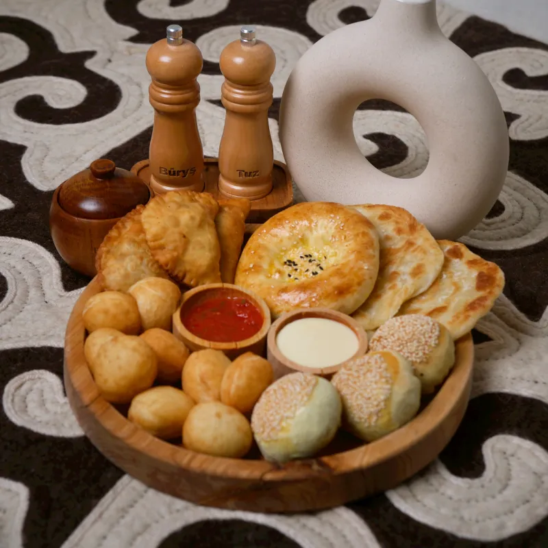 Мини чебуреки, бауырсаки, мини самса, каттама нан, лепешка, соус восточный и балкаймак.